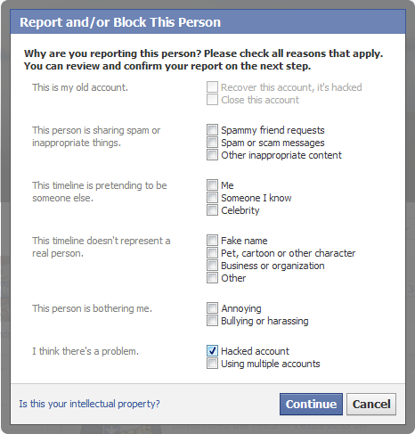- Centang di pilihan ‘Hacked account’. Klik tombol Continue