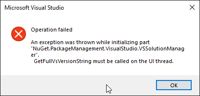Description: An exception was thrown while initializing part "NuGet.PackageManagement.VisualStudio.VSSolutionManager".